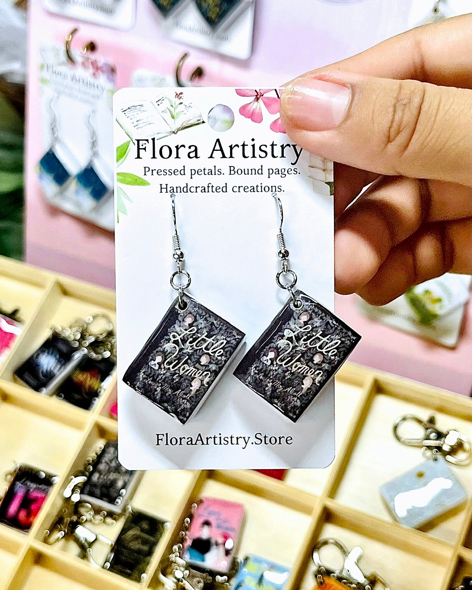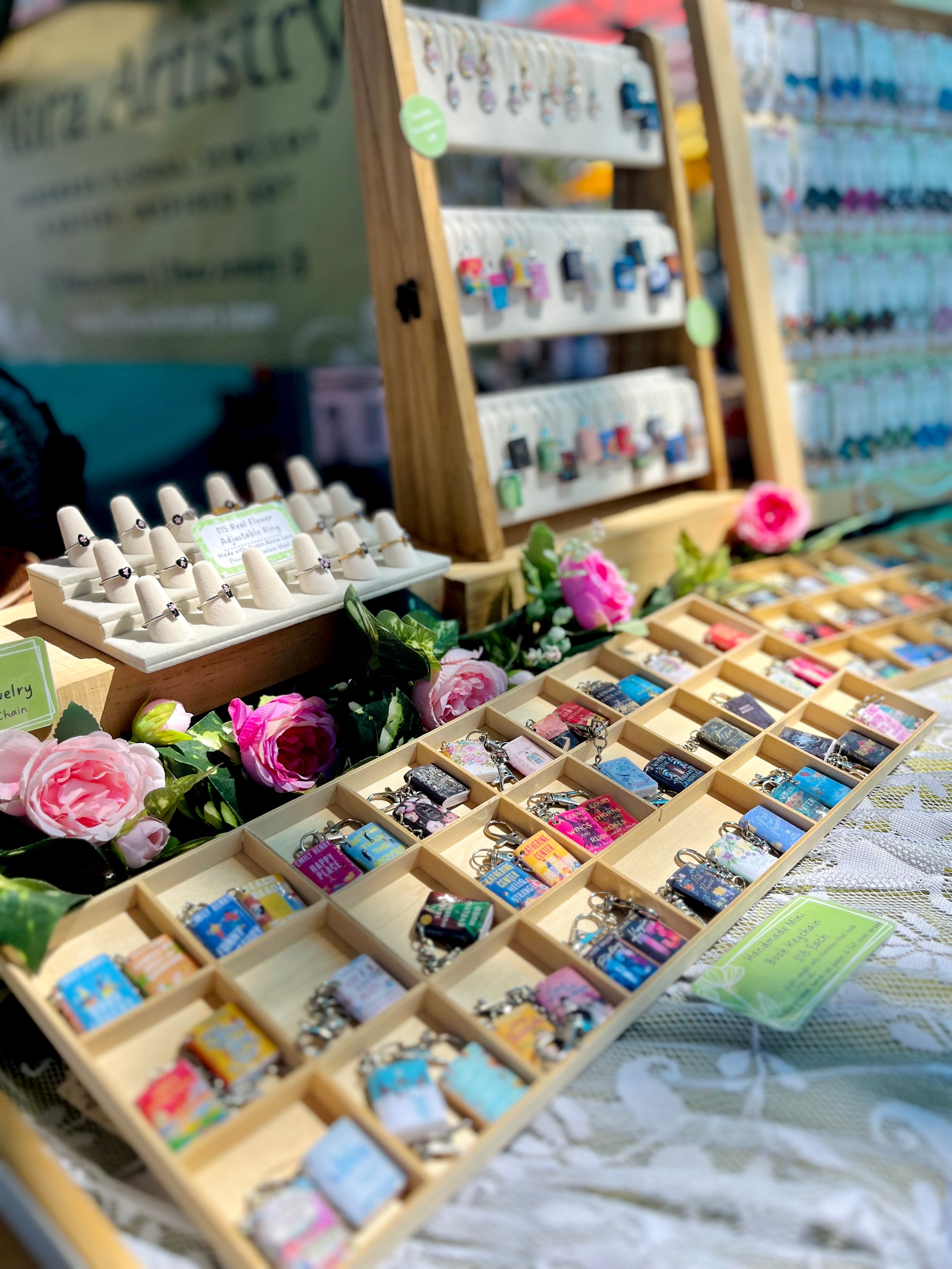 Real flowers & handmade book charms preserved in and embossed in wearable resin! All handcrafted to be one-a-kind pieces.
