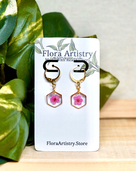 Hot Pink Pressed Flower Huggie Hoops Earring