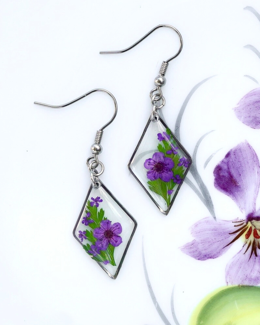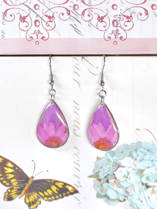 White Daisy & Purple Zennia Wildflower Teardrop Earrings