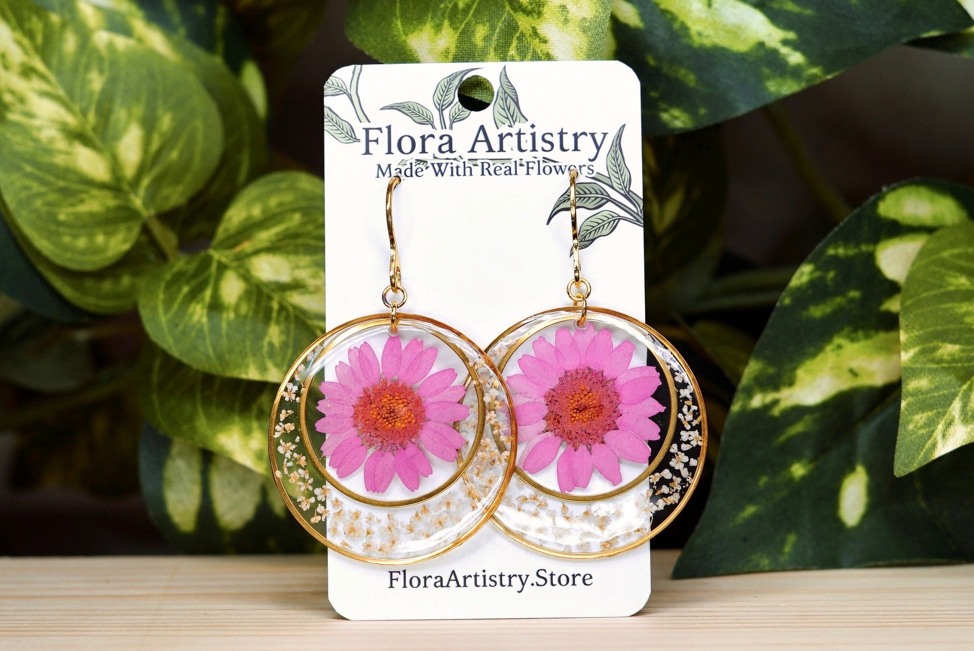 Bohemian Pink Daisy Flower Circle Dangle Earrings